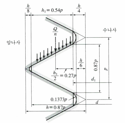삼각나사의 경우 굽힘에 의해 파괴된다고 간주하고 사각나사와 사다리꼴 나사는 전단으로 파괴된다고 간주하여 계산하는 것이 일반적입니다.