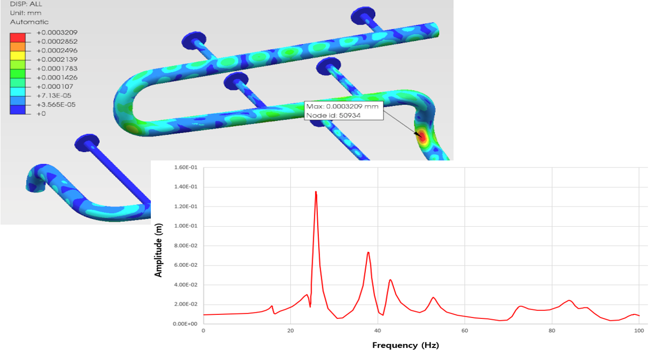 아래는 진동이 발생되고 있는 파이프 구조물의 체결에 대한 진동해석 사례를 나타냅니다. 일상생활의 환경에서 발생하는 다양한 진동 문제를 구조해석을 통해 분석하고 사고를 방지할 수 있습니다.