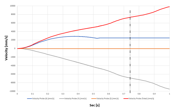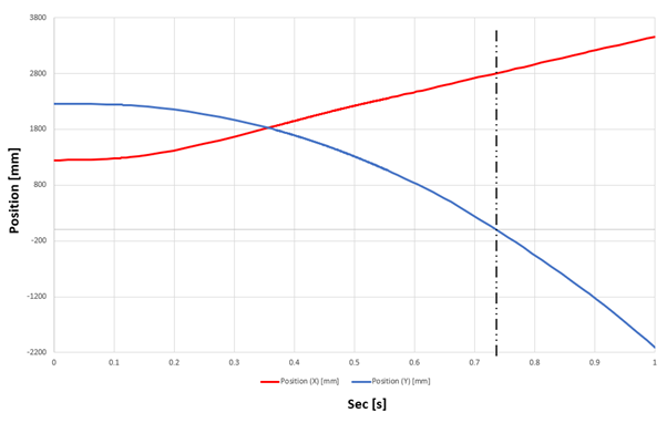 강체동역학 해석결과 지면에 충돌하는 순간은 0.745초이고 이때의 위치 및 속도를 산출할 수 있습니다. 산출된 데이터는 충돌해석의 Input Data로 사용 됩니다.