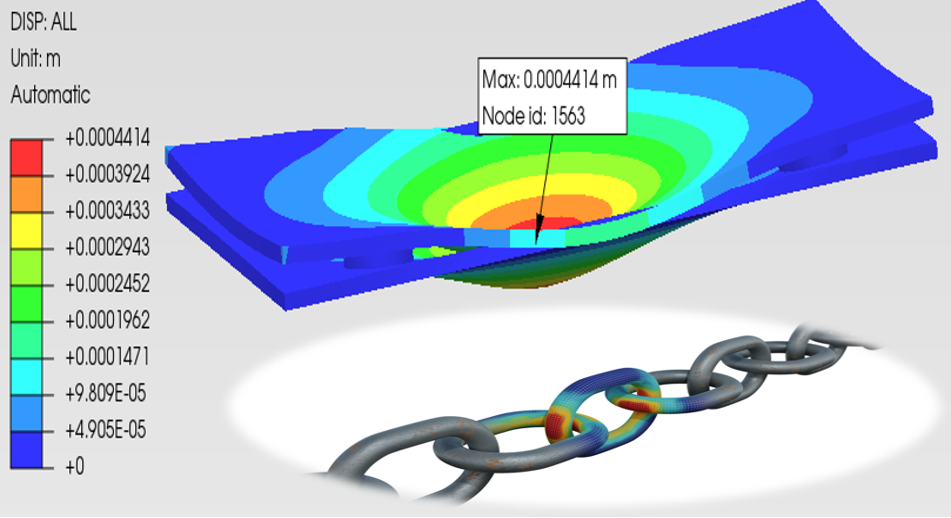 위 해석 결과를 바탕으로 지면과 충돌하는 위치를 알 수 있어 충돌 완충제의 위치 선별을 가능하게 합니다.