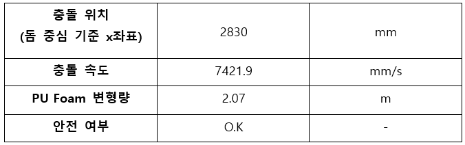 상기 내용을 근거로 충돌 해석을 수행하고, PU Foam의 변형량 확인을 통해 안전성 여부를 판단합니다.