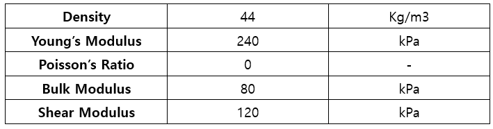 본 해석에서는 일반적으로 흔하게 사용되는 완충제인 PU(폴리우레탄) Foam을 사용하였습니다.