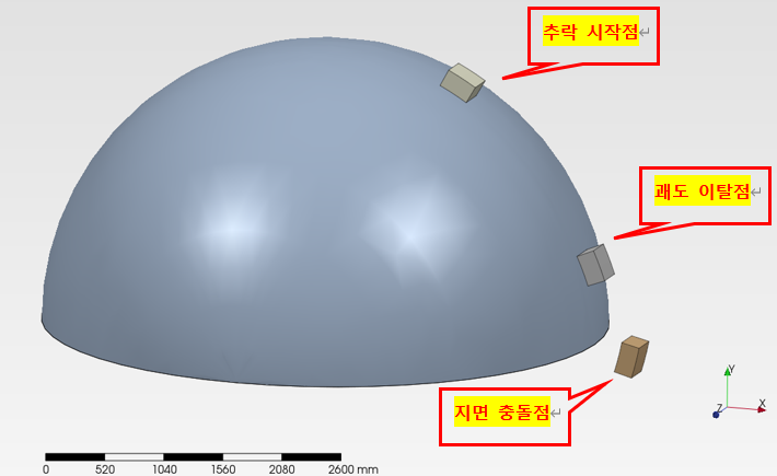 Step1) 돔 외벽 이탈 위치 및 지면 충돌 시 순간속도 도출