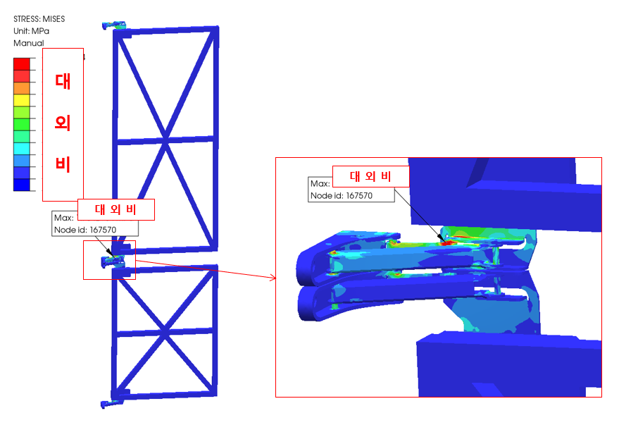 힌지 구조물 정적 구조해석 결과 강성 및 강도 안전도가 확보됨을 확인하였습니다.