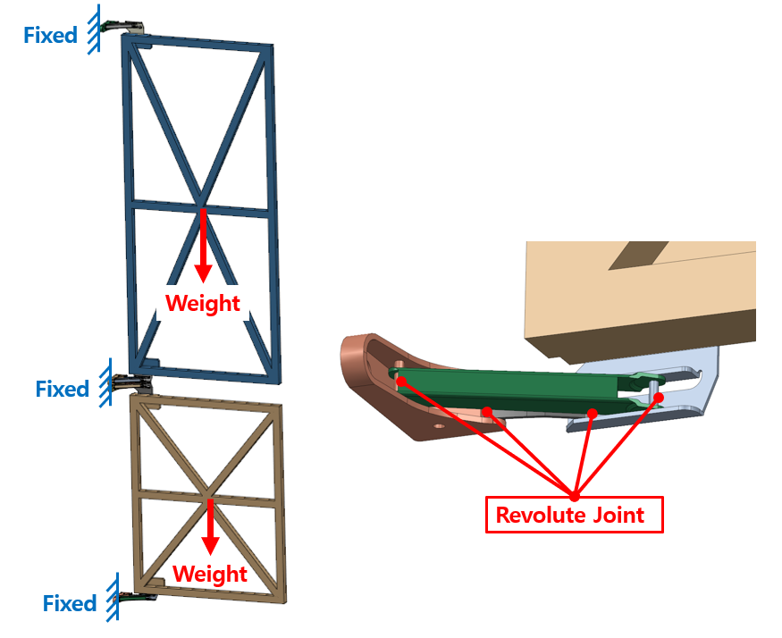 도어 힌지의 경계조건은 힌지와 바디와의 체결부를 Fixed 하고, 힌지의 각 Pin 체결부에 Revolute Joint를 부여하여 회전방향 자유도를 갖도록 하였습니다. 끝으로 하중 조건을 무게 중심에 작용하도록 하여 도어의 최대 하중 상태에서 구조물의 최대 변형과 등가 응력을 확인할 수 있도록 하였습니다.