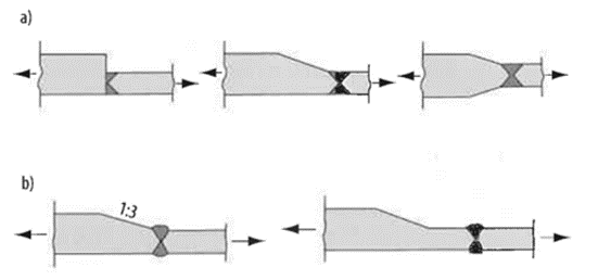 맞대기 용접은 응력 흐름이 상대적으로 자연스럽고 국부적인 굽힘 모멘트가 작기 때문에 피로 문제에 효과적입니다. 때문에 가능하다면 필릿 용접보다는 맞대기 용접을 배치하는 것이 피로 강도 향상에 도움이 됩니다.