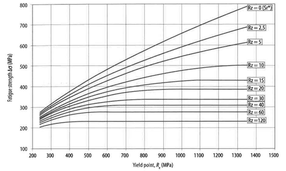 특히, 특정 Rz 값에서 특정 항복 강도에서의 피로 강도가 더 이상 증가하지 않고 수평을 유지하는 것을 확인할 수 있는데 해당 지점은 균열이 발생되어 균열 성장이 시작된 시점이라고 볼 수 있습니다.