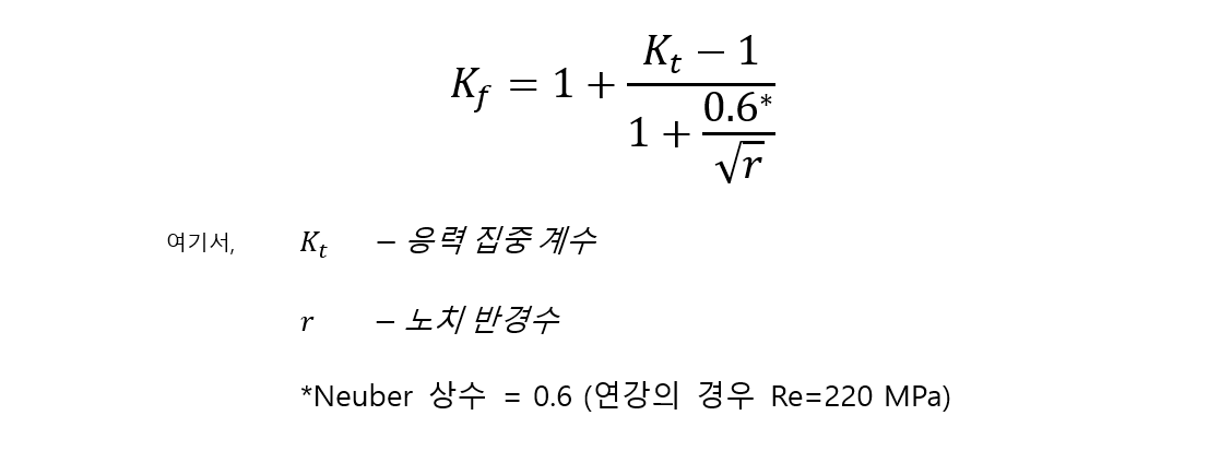 응력 집중 계수에 따른 피로 강도의 감소의 상관관계를 나타내기 위한 식은 아래와 같고, 피로 강도 노치 계수를 Kf로 정의합니다.