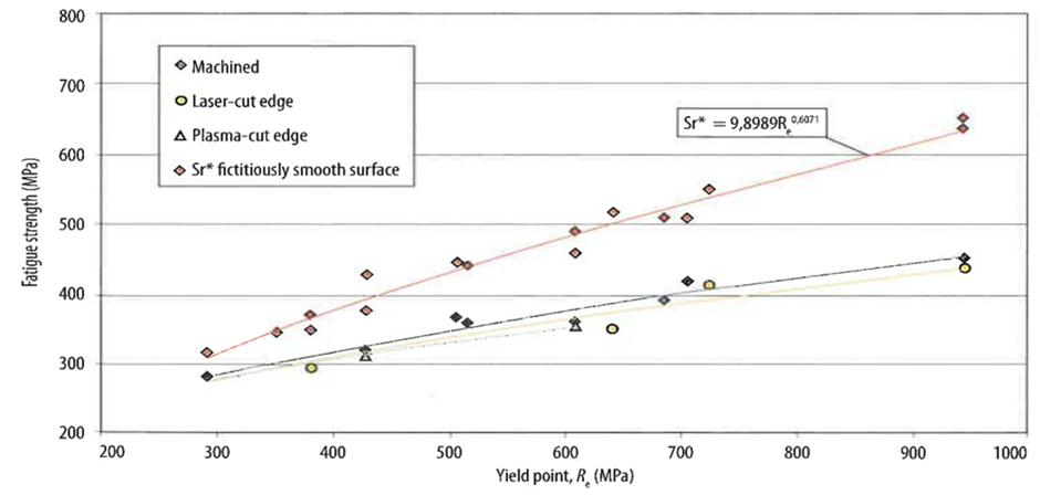 모재의 피로 강도는 강재의 강도와 함께 증가합니다. 또한, 이 증가율은 재료의 표면 상태에 따라 달라지기 때문에 열연 강재보다는 냉연 강재가 피로 강도가 더 높습니다(냉연 표면이 열연 표면보다 표면 상태가 좋습니다).