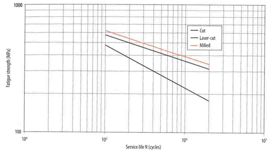 그림 4는 강판의 모서리를 밀링, 레이저 커팅, 단순 전단으로 구분하여 피로 강도를 측정한 것(항복강도 700 MPa 열연강판 기준)으로 단순 전단한 것이 피로 품질이 가장 낮은 것을 확인할 수 있습니다. 그와 반대로 밀링 등의 기계 가공은 피로 품질을 높입니다.