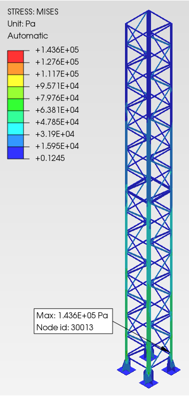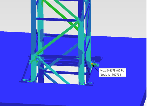 고정식과 상승식 각각 작동원리에 맞는 경계 및 하중 조건을 부여하여 구조해석을 진행, 구조적 안전성을 검토하여 설계적 검증 또는 사용조건의 제한사항 선정을 할 수 있습니다.