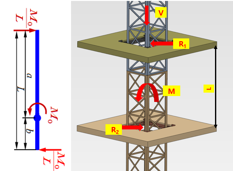 하중 조건은 고정식과 동일하며 이때의 마스트는 모멘트와 수직 및 수평하중이 작용하는 단순지지보로 간주할 수 있습니다.