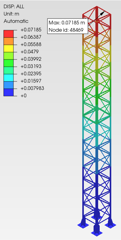 마스트 높이가 높아질수록 안전성을 저하 시키는 요인은 모멘트가 아닌 횡 방향 하중입니다. 마스트 높이가 20 m 일 때와 100 m 일 때 풍하중의 영향을 비교하면 100 m 일 때가 지면 근처 구조물에서 발생하는 응력 값이 더 큽니다.
