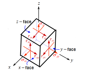 물체 내의 응력 상태는 일반적으로 3차원으로 분포하기 때문에 미소 직육면체를 가정하고 각 면에 작용하는 좌표축 방향에 대한 응력 성분으로 표시하면 편리합니다.