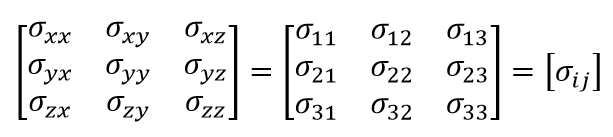 즉 응력 텐서를 아래와 같은 3행 3열의 행렬로써 표시할 수 있습니다.