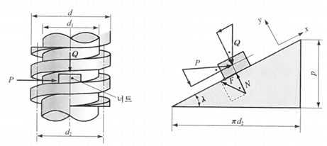 이때의 경사면에 따른 경사각 λ는 볼트의 리드각을 의미합니다.