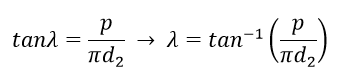 이때 리드각 λ, 피치 p와 유효지름 d2의 관계는