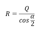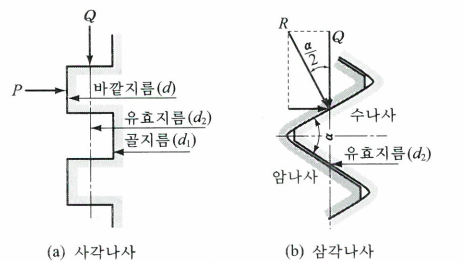 삼각나사는 나사면이 경사져 있으므로 위에서 언급한 축 방향 힘 Q와 삼각나사의 경사면에 작용하는 수직력 R 과의 관계는 아래와 같습니다.