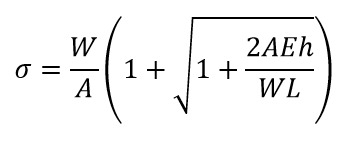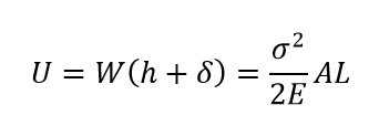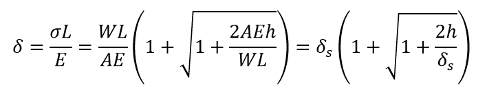 위 그림과 같이 하중 W가 h의 높이에서 낙하할 때 봉의 신장량을 δ라고 하면, 외부에서 한 일 량 W(h+δ)는 봉의 내부에 축적되는 변형에너지 U와 같으므로 다음 식이 성립합니다.