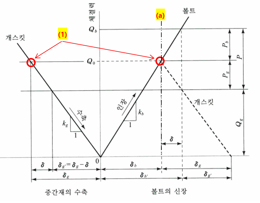 초기 체결력이 Q0인 상태 즉, 위 그림의 (1) 상태에서 추가 하중이 볼트에 Pb 만큼 작용하게 되면 볼트는 신장하게 되고 개스킷은 볼트가 신장한 만큼 동시에 수축하게 됩니다.
