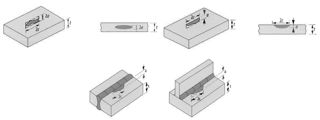 그림 5는 용접부의 결함을 타원형(내부 결함)과 반 타원형(표면 결함)으로 가정하여 나타낸 것입니다.