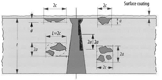 이러한 균열 깊이나 크기는 NDT(비파괴 시험)을 기반으로 크기를 산정할 수 있고 형상에 대한 기초적인 내용은 그림 4를 기반으로 합니다.
