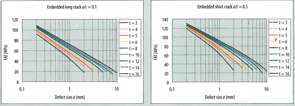 IIW에서는 균열 깊이나 크기에 따른 피로 강도 FAT 값을 제시하고 있습니다(그림 6).