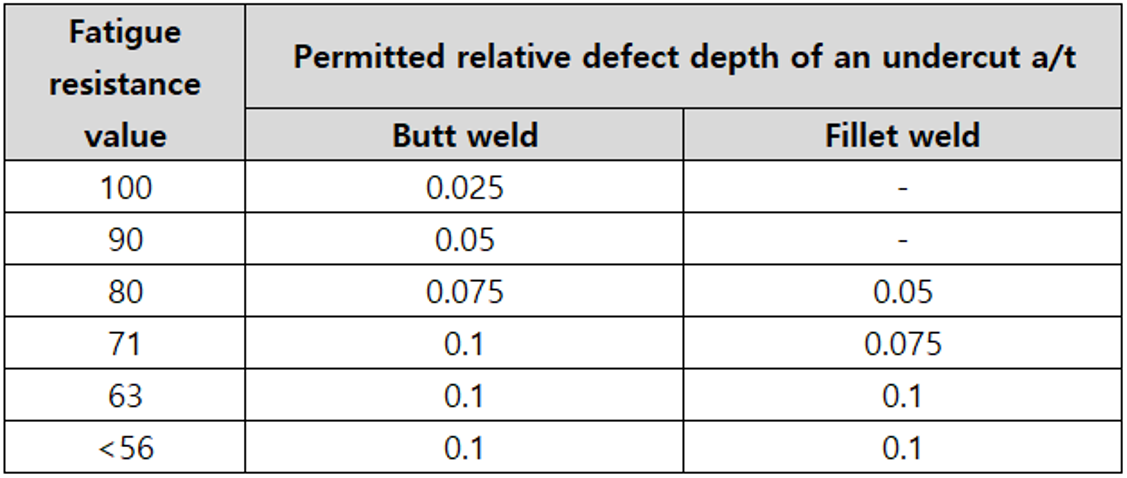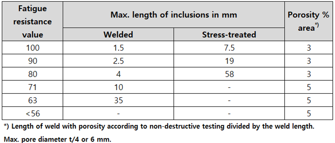 언더컷과 슬래그 및 다공성의 제한사항으로 피로 강도 FAT 값에 따른 허용 수준을 제시하고 있습니다. 아래 표 1, 2를 참고할 수 있습니다.